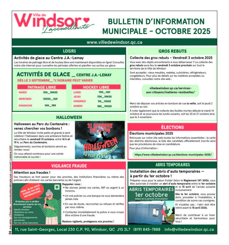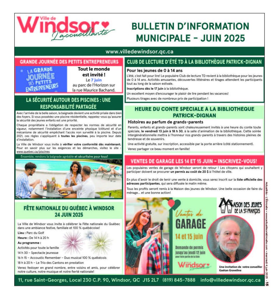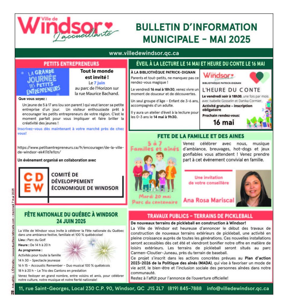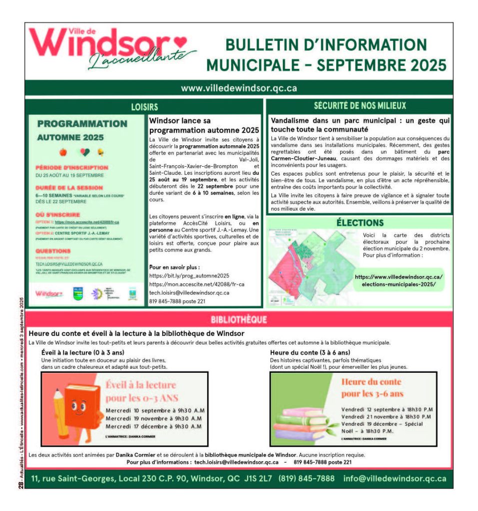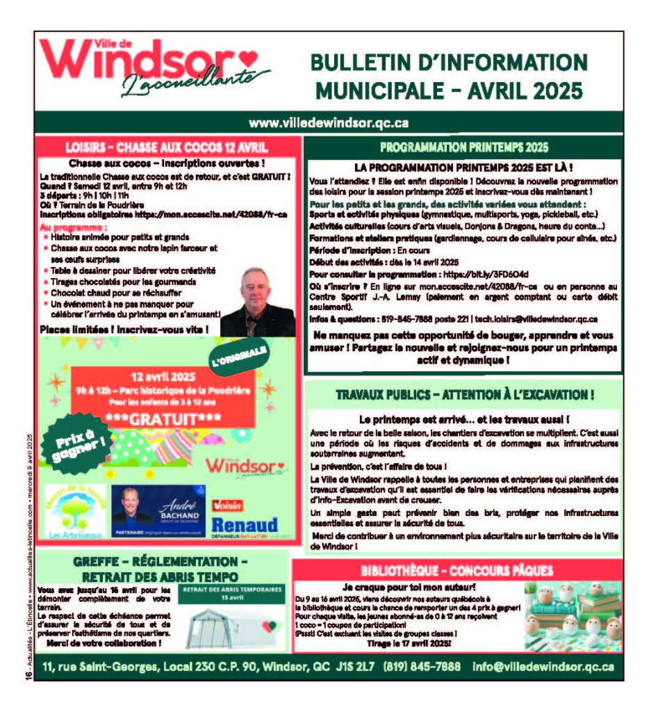 Le bulletin d’information municipale est une publication mensuelle qui est disponible dans l’édition du Journal L’Étincelle suivant le conseil municipal. Vous y trouverez différentes rubriques concernant les services municipaux telles que les loisirs, les travaux publics, la gestion du territoire et de l’urbanisme, le service du greffe ainsi que la trésorerie. Des informations concernant nos organismes partenaires et divers messages d’intérêt public y seront également publiées sur une base régulière.