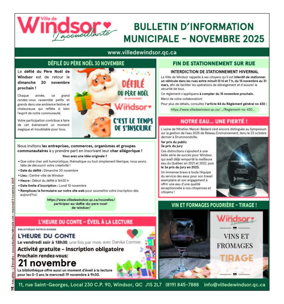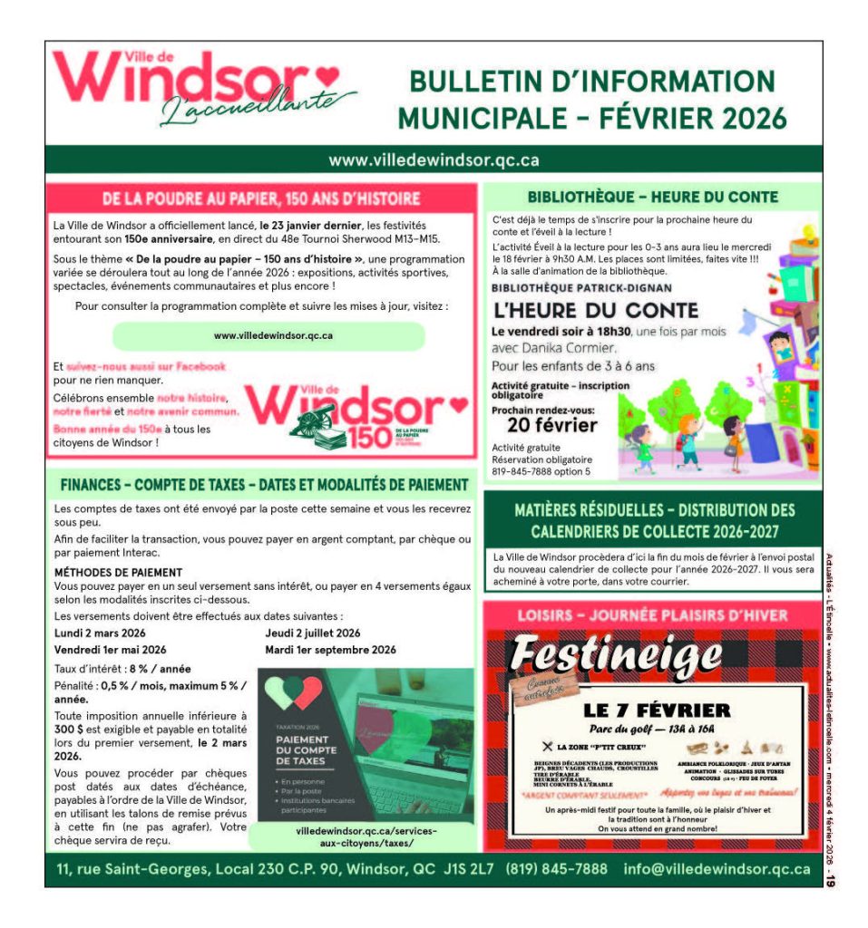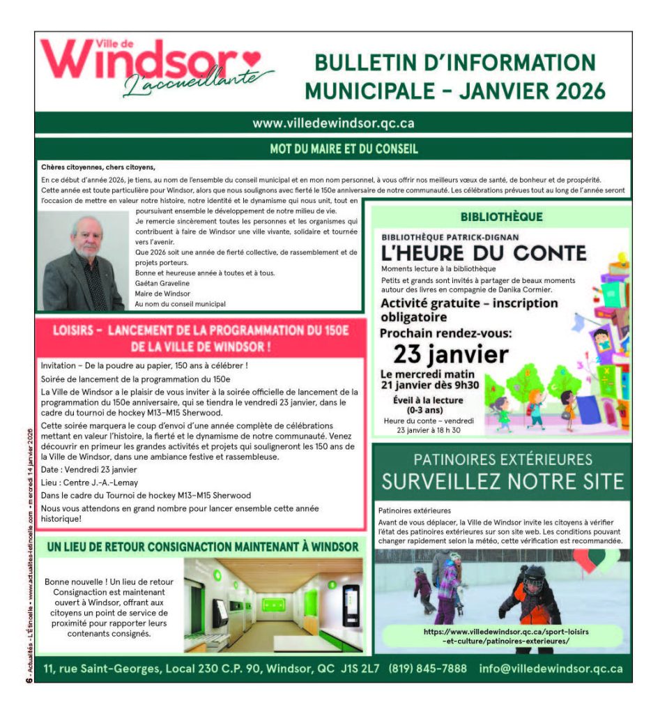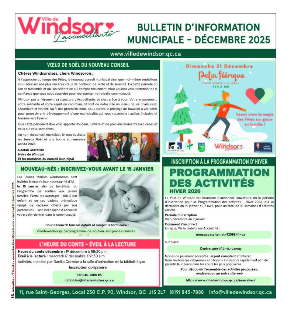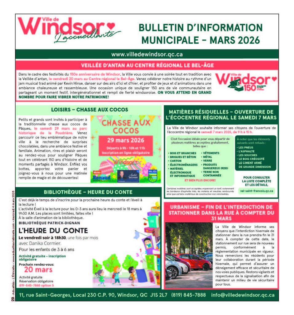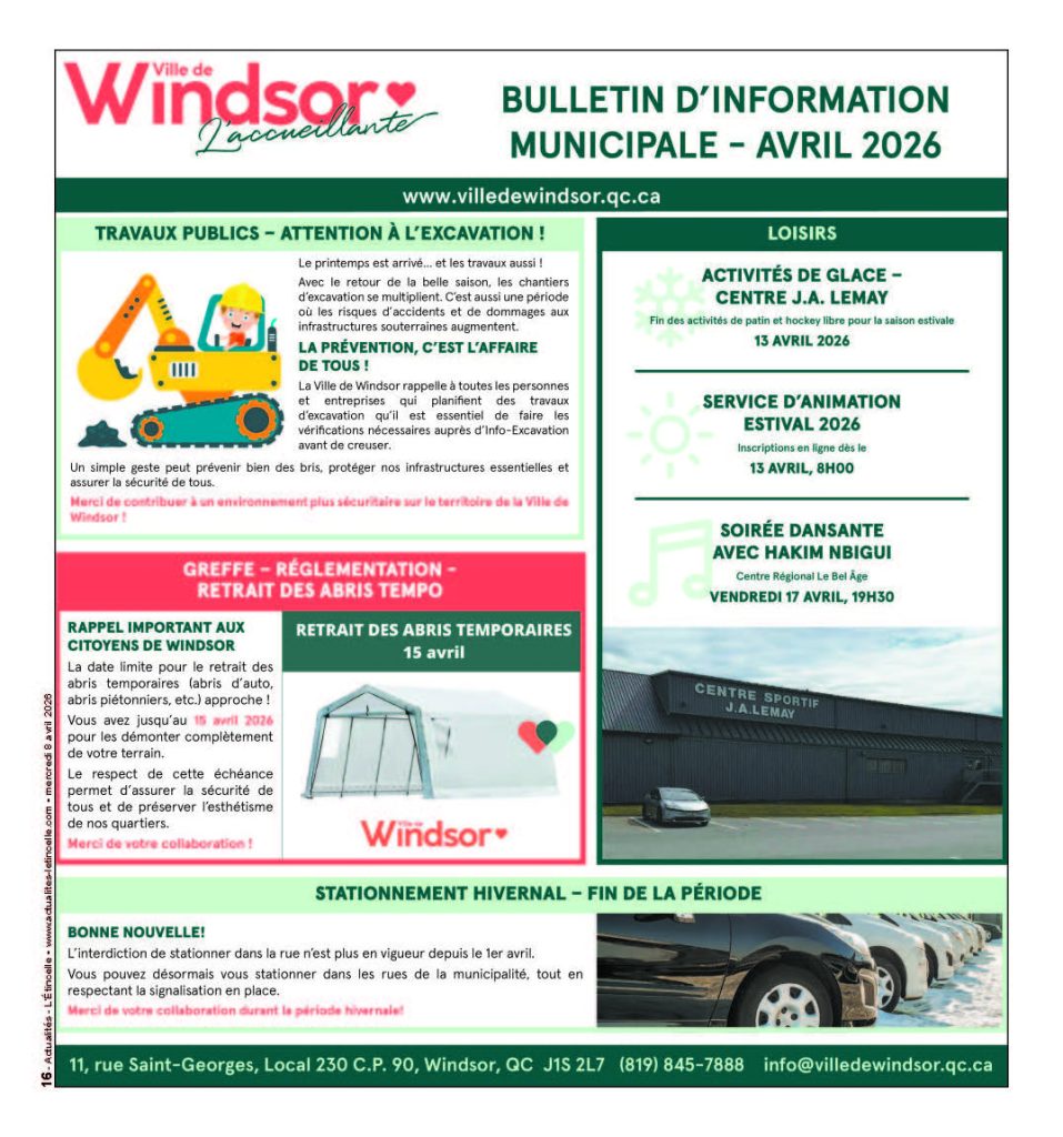 Le bulletin d’information municipale est une publication mensuelle qui est disponible dans l’édition du Journal L’Étincelle suivant le conseil municipal. Vous y trouverez différentes rubriques concernant les services municipaux telles que les loisirs, les travaux publics, la gestion du territoire et de l’urbanisme, le service du greffe ainsi que la trésorerie. Des informations concernant nos organismes partenaires et divers messages d’intérêt public y seront également publiés sur une base régulière.