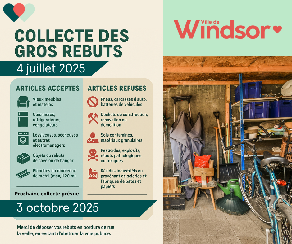 La saison estivale (et la période des déménagements) est souvent synonyme de grand ménage ! La Ville de Windsor vous facilite cette tâche en tenant sa prochaine collecte des gros rebuts le vendredi 4 juillet 2025. C’est l’occasion idéale pour vous départir d’objets encombrants qui ne peuvent pas être pris en charge par la collecte régulière des ordures.